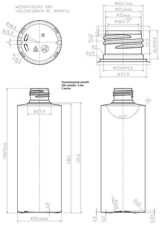 Пластиковый флакон цилиндрической формы, объемом 250 мл (смотреть всю линейку флаконов Д), может комплектоваться дозатором, кнопочным распылителем или крышками флип-топ, диск-топ.